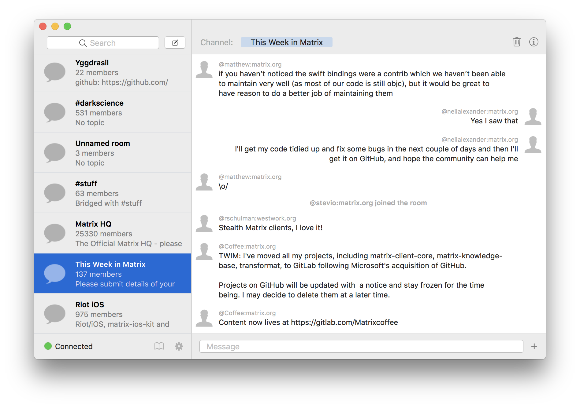 More news from the JVM-world: I've just released the first Alpha version (v0.1.0) of Palaver, a Desktop client written in Kotlin: https://github.com/MrCustomizer/palaver/releases/tag/v0.1.0. As backend it uses the matrix-java-sdk, the GUI is written in TornadoFX, a Kotlin-Wrapper for JavaFX. The room for this client is #palaver:matrix.localtoast.de. The current features are listed in the changelog: https://github.com/MrCustomizer/palaver/blob/v0.1.0/CHANGELOG.md. And there is a little demo video on youtube, too: https://www.youtube.com/watch?v=AuGuxAPuRIM.